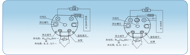 说明:如果输入距离较远,影响精度的话,几种型号的温度变送器均可做成三线制输入接法无需接补偿导线,从而减小误差,提高了精度,也可选择智能型变送器达到测量目的。