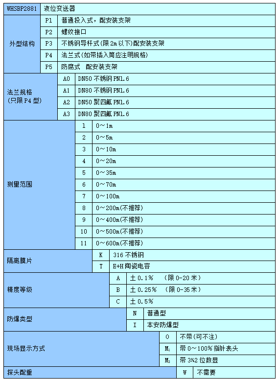 WHSBP2881液位变送器是引进美国NOVA公司先进的扩散硅压力传感器和德国E+H公司陶瓷电容传感器及ICSensors电路技术开发而成的,它应用了硅精蚀工艺和硅晶片叠合两项世界尖端技术,是一种高品质的静压式液位测量仪表,广泛适用于石油、化工、冶金、环保、食品、水利、城市供水,油田等行业的液位测量。 WHSBP2881液位变送器的卓越品质,多种安装方式方便了工艺现场的安装,特殊场合可特殊设计,满足了我国工业自动化及部分行业的计量高精度液位检测仪表的需求。